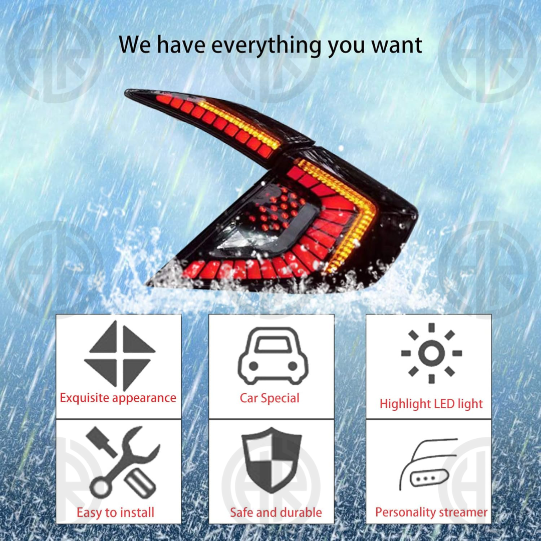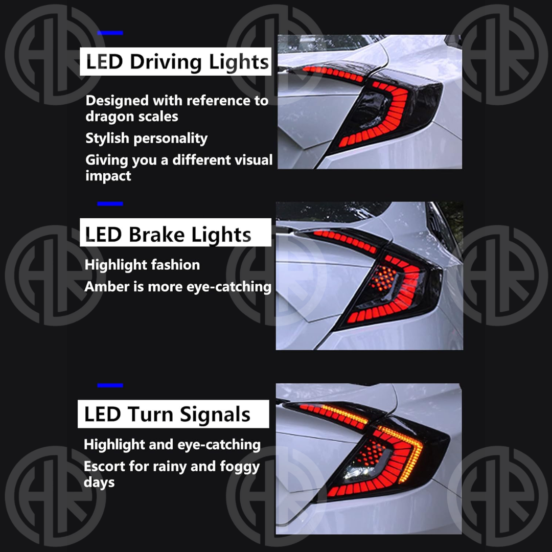 Transform your Honda Civic X with Dragon Style Backlights, designed to add a bold, aggressive touch to your car’s rear end. Built with premium LED and projector technology, these tail lights not only improve visibility and safety but also deliver a unique, modern aesthetic that makes your Civic X stand out day or night.